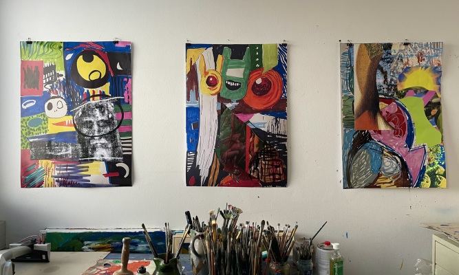 In Collagen, Malereien und plastischen Arbeiten begegnen sich Fragmente, Symbole und Formen ohne endgültige Erzählung. Die Verfahren sind oft schichtend, überlagernd, tastend. Dadurch entsteht eine Bildlogik, die weniger auf Eindeutigkeit als auf Ambiguität basiert. Die Vielschichtigkeit des Materials entspricht der Vielschichtigkeit der Wahrnehmung selbst — jener Unschärfe, aus der Weltbilder im Denken und Fühlen hervorgehen.