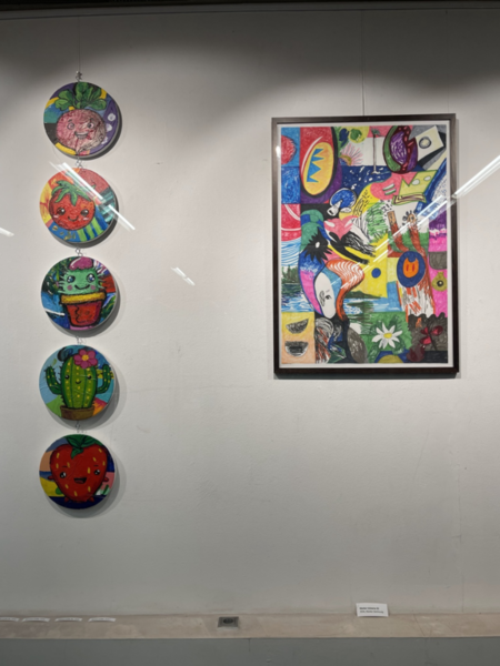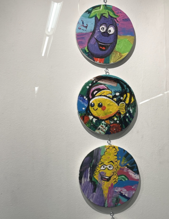 Ich habe diese 15 kleinen kreisförmigen Bilder zu einer Art dekorativem Muster in drei Reihen zu je 5 Bildern gehängt. Sie erkennen Früchte, Gemüse, zwei Kaktusse und einen Fisch, die uns jetzt anlachen, angrinsen – mit einem gewissen Kindchen-Schema. Doch bei mir kippt das Niedliche in Übersteuerung: Figuren, die zu laut lachen, zu groß gucken, zu grell auftreten. Sie sind nicht glatt, nicht sauber und nicht digital perfektioniert. Stattdessen werden sie durch die Malerei aufgeraut, intensiviert, überschrieben. Farben prallen aufeinander, Konturen schwanken, Flächen geraten in Bewegung. Die Figuren erscheinen wie Masken: freundlich und gleichzeitig unheimlich, einladend und doch schwer zu greifen.