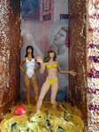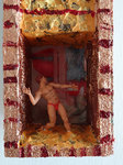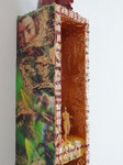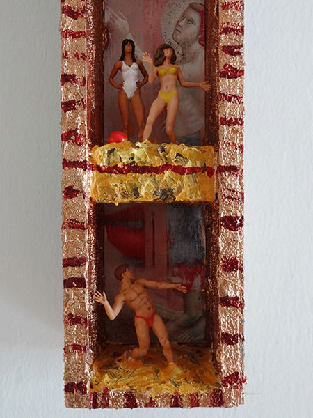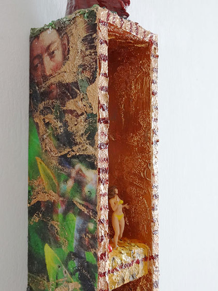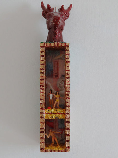 Die Geschichte von Diana und Aktaion habe ich hier als Thema einer kleinen Wandskulptur genommen, wobei hier der Hirschkopf als Metamorphose Aktaions in Form einer Wachsplastik oben thront. Diese Wachsplastik kann man wie eine Kerze anzünden.