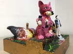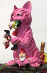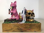In meiner Wichtelei geht es drunter und drüber: Ein Wichtel liegt am Boden, den Dolch noch in seinem Rücken, während ein rosa Kater gerade einen Wichtel am Schlafittchen gepackt hat und mehrere andere in seinen Klauen hält. Im Gegensatz zur nordischen Mythologie, wo die Zwerge meist unterirdisch schlau, zauberkundig und hilfreich werkeln, haben sie schon lange den irdischen mitteleuropäischen Vorgarten erobert, wo sie eine dekorativ eher unrühmliche Rolle spielen. Aber sind sie deshalb schon dem Untergang geweiht - was ein skulpierter und bemalter Totenkopf anzudeuten scheint?