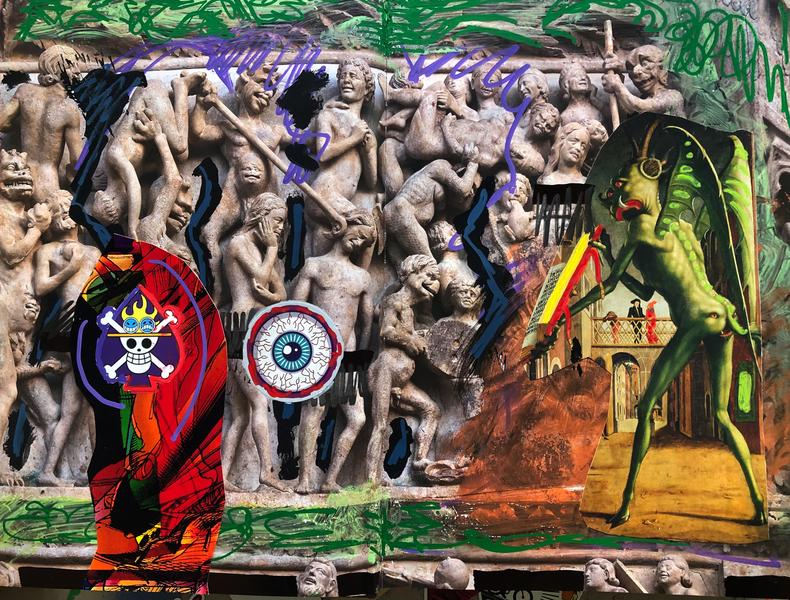 Der Teufel tritt auf - als chaotische, zersetzende Kraft, die in comicartigen Explosionen, deformierten Gestalten, grellen Farbsplittern und Bild-Fragmenten sichtbar wird. Das „Buch“ schließlich fungiert als Metapher für Überlieferung, Wissen und Deutungshoheit – aber auch für eine Gegenwart, in der Bedeutungen nicht mehr stabil sind, sondern in Schichten, Zitaten und Brüchen weiterleben.