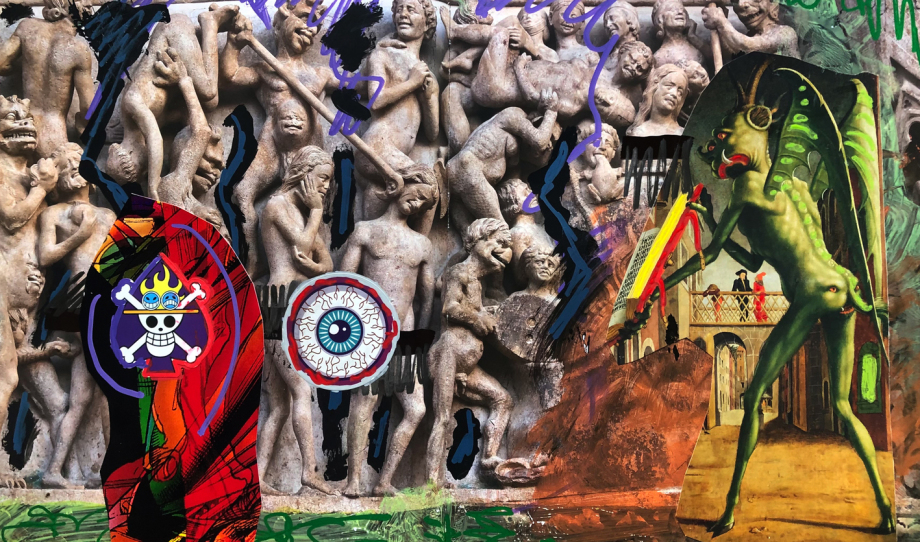 Mein modernes Polyptychon „Christus, der Teufel und das Buch“ entfaltet sich wie ein visuelles Spannungsfeld zwischen Tradition und Gegenwart, zwischen Ikonografie und Popkultur, zwischen Andacht und Bildrauschen. In einer Folge von vielschichtigen, collageartigen Tafeln begegnen sich klassische Darstellungen des leidenden Christus und des Teufels mit Elementen aus Comics, früherer Malerei, digitaler Ästhetik und Fragmenten profaner Bildwelten.