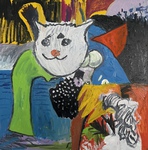 Doch diese Nähe bleibt nicht ungebrochen. Die Figuren wirken niedlich und zugänglich, zugleich aber auch übersteigert, eigenwillig und leicht irritierend. Die Malerei zeigt sich dabei bewusst als Malerei – mit sichtbaren Pinselspuren, Überlagerungen, Brüchen und Unschärfen. Das Glatte, Perfekt-Reproduzierbare der Cartoonwelt wird hier nicht nachgeahmt, sondern unterlaufen.