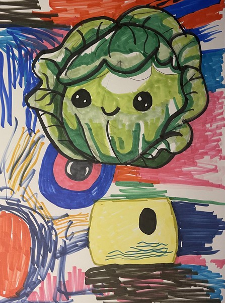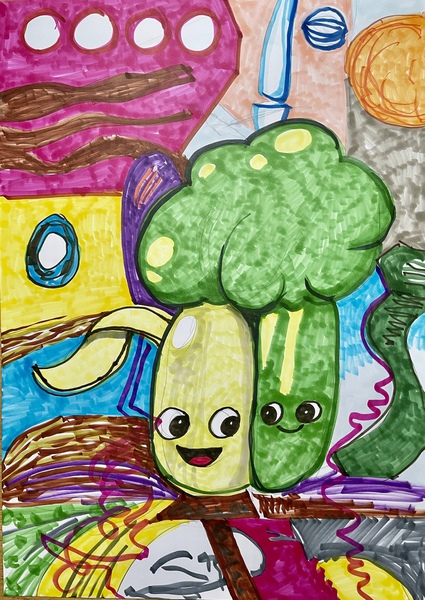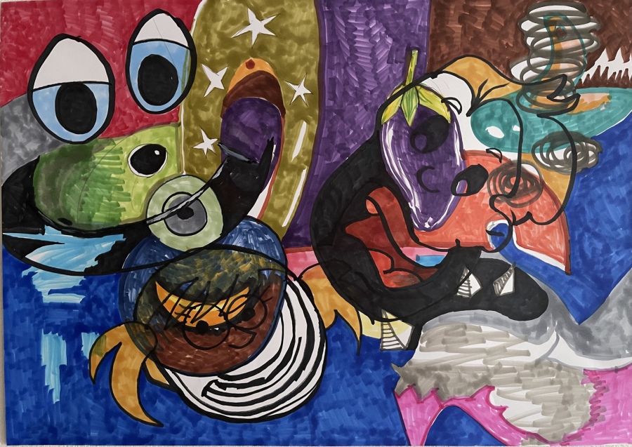 Die spontane Linienführung der schwarzen Konturen und die sichtbaren Markerstriche betonen den unmittelbaren, gestischen Charakter der Arbeit. Nichts wirkt vollständig geglättet oder perfektioniert – gerade diese Direktheit verleiht der Zeichnung Energie und Lebendigkeit. Die Formen überlagern sich, Figuren verschmelzen teilweise mit dem Hintergrund, sodass ein lebendiges Geflecht aus Farbe, Linie und Bewegung entsteht – ein Ort, an dem Fantasie, Humor und visuelle Übertreibung bewusst miteinander kollidieren und koagieren.