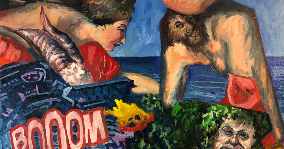 In meinem Ölbild „Vesuvio“ habe ich die zwei Satyrn von Rubens als Bildquelle zusammen mit einem Pizzabäcker vor der malerischen Kulisse des Vesuvs und des Golfes von Neapel mit einer klassischen Maske rechts unten in Szene gesetzt.