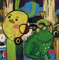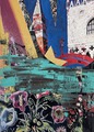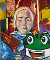 Die Arbeiten operieren mit Fragmentierung, Überlagerung und einer bewusst offenen Bildlogik. Figuration und Abstraktion, Pop-Referenzen, kunsthistorische Zitate, organische Formen und grafische Zeichen stehen gleichwertig nebeneinander. Diese visuelle Vielstimmigkeit findet in den Texten ihre Entsprechung: Auch die Sprache ist nicht linear, nicht erklärend, sondern tastend, assoziativ, manchmal widersprüchlich. Bild und Text bilden kein geschlossenes System, sondern ein Spannungsfeld.