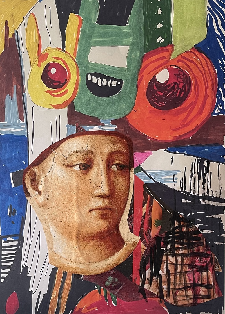 Die Collage scheint diese Einsicht visuell zu wiederholen: Der klassische Kopf wird nicht zerstört, sondern in ein Spiel der Masken hineingezogen. Über ihm entsteht eine Art absurdes Theater, in dem die Physiognomie sich auflöst in Zirkularität, Farbe, Rhythmus.