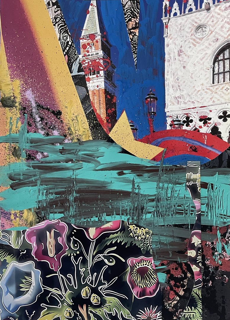 Im oberen Teil der Collage lassen sich klar identifizierbare architektonische Motive ausmachen. Der schlanke, vertikal aufragende Campanile di San Marco bildet eine visuelle Achse, während rechts davon ein Ausschnitt des Dogenpalast mit seinen hellen Steinflächen und gotischen Fensterformen erscheint. Diese Bauwerke fungieren als ikonische Marker venezianischer Geschichte und Macht. Zugleich sind sie angeschnitten, überlagert und von Farbspritzern durchzogen, sodass ihre Monumentalität gebrochen wird. Sie wirken weniger wie stabile Architektur als wie Bildzitate, die dem Zugriff der Malerei ausgesetzt sind.