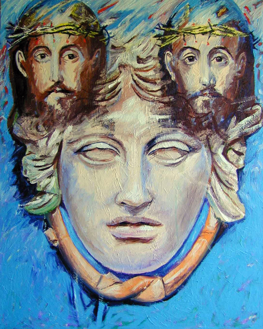 Über der Medusa sind zwei nahezu spiegelgleiche Christus-Köpfe, beide nach El Greco: längliche Gesichter, schmale Nasen, melancholische Augen, der Bart als dunkler Schatten, die Dornenkrone wie ein grüner, dorniger Ring.