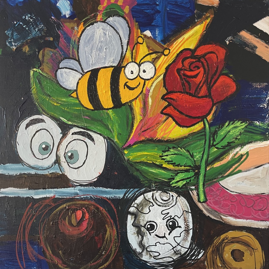 Die Biene im oberen Bereich mit ihrem cartoonhaften Lächeln wirkt fast unheimlich optimistisch. Ihr fröhlicher Ausdruck steht im Widerspruch zu der visuell unruhigen Umgebung. Das Lächeln wird dadurch ambivalent: Es könnte ebenso gut als naive Verharmlosung gelesen werden, als Symbol einer oberflächlichen Positivität, die über eine komplizierte Realität hinwegschwebt
