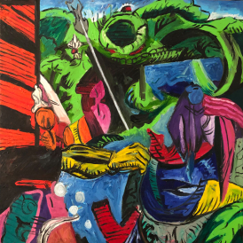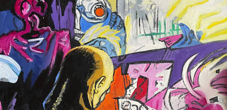 Der Weg von den erkennbaren Comic-Motiven führt in diesen Bildern zu deren Abstraktion. Das Wiedererkennen der Comic-Formen steht am Anfang der Betrachtung und dann beginnt eine Suche, die zu dem Ergebnis führt, dass die Konstruktion von Szenischem rund um Superhelden und andere Comicfiguren nicht gelingt, dass wir es also mit fast abstrakten Formen zu tun haben, in denen das Konkrete des Comics nicht aufgeht.