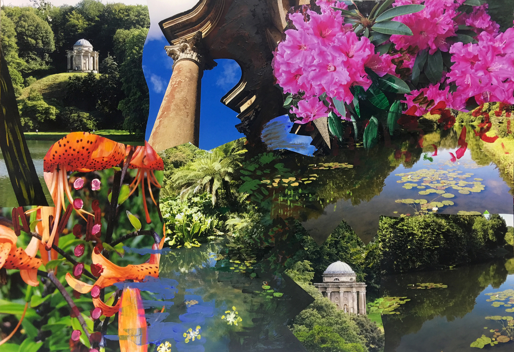 Zentrales Merkmal der Serie ist der collagistische Ansatz: Fotografische Fragmente, malerische Gesten und zeichnerische Elemente greifen ineinander und überlagern sich. Perspektiven kippen, Maßstäbe lösen sich auf. Ein Garten wird gleichzeitig realer Ort, ornamentale Fläche und Traumraum. Architektonische Versatzstücke – Tempel, Ruinen, Pavillons – erscheinen nicht als feste Orientierungspunkte, sondern wie Fundstücke aus unterschiedlichen Zeiten, die in einer neuen, inneren Logik zueinanderfinden.