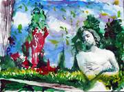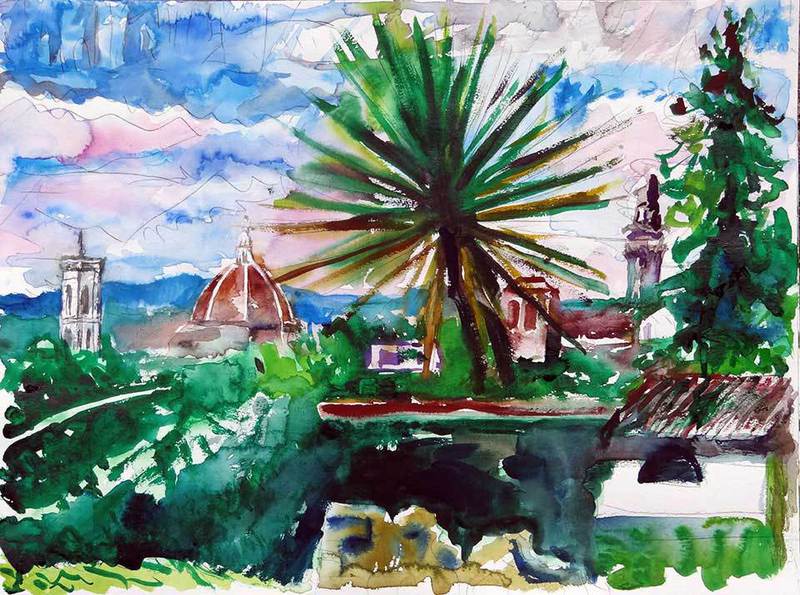 Die drei Aquarelle der Serie „Boboli-Gärten“ wirken wie gemalte Collagen – Fragmente, die sich zu neuen, vielschichtigen, fast surrealen Bildern fügen. Einzelne Formen und Farben scheinen sich aneinanderzureiben, überlagern sich, verschieben sich – und gerade aus dieser Brüchigkeit entsteht eine fremdartige Harmonie.