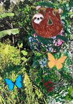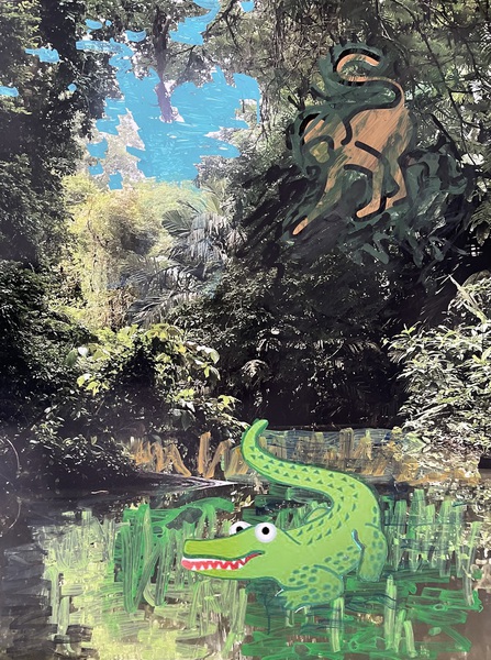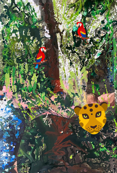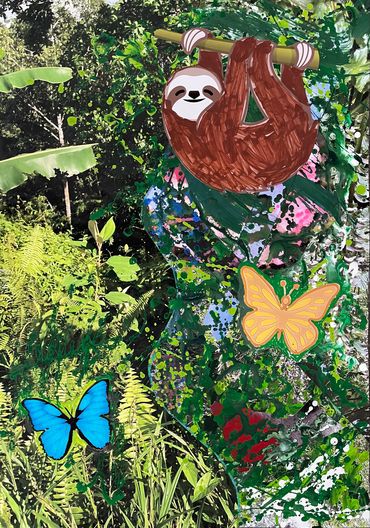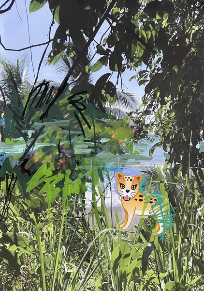 Was auf den ersten Blick verspielt wirkt – das lächelnde Faultier, die bunten Schmetterlinge, die comicartigen Jaguare – birgt zugleich eine gebrochene Ironie. Die heitere Oberfläche kontrastiert mit der Erkenntnis, dass auch diese Idylle fragil ist: eine inszenierte, fast touristische Projektion, hinter der sich Fragen nach Wirklichkeit, Naturwahrnehmung und menschlicher Aneignung verbergen.