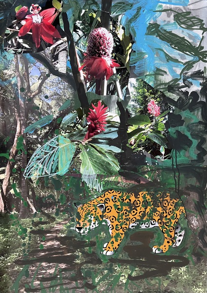 Durch die Kombination von Fotografie und malerischer Geste entsteht so ein Spannungsfeld zwischen Faszination und Distanz, Authentizität und Inszenierung. Die Collagen feiern die Schönheit des Dschungels – und unterlaufen sie zugleich mit einem Augenzwinkern. Sie sind Hommage und Kommentar zugleich, Erinnerung und Reflexion über das, was vom Reisen bleibt: Bilder, die zwischen Staunen und Zweifel pendeln.