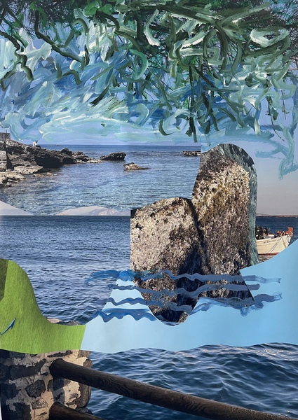 Die Collage bildet dabei eine Art archäologische Oberfläche: einzelne Bildstücke wirken wie Fundstücke eines Ortes – Bruchstücke von Meer, Stein, Himmel und Pflanzen. Die malerischen Eingriffe greifen diese Fragmente auf, verbinden sie oder lösen sie bewusst wieder auf. Breite Pinselspuren, fließende Linien und farbige Felder durchziehen die fotografischen Elemente und schaffen Übergänge zwischen Realität und Imagination.