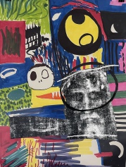 Durch Überlagerung, Malerei, Spritztechnik und Markerzeichnung entsteht ein visuelles Spannungsfeld, in dem das Bekannte ins Abstrakte übergeht. Figuren, Gesichter und Objekte lösen sich im Farbrausch auf, tauchen wieder auf und verschwinden im nächsten Moment. Die Betrachter werden eingeladen, in diesem Chaos nach Orientierung, Bedeutung und Rhythmus zu suchen.