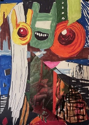 Fragmentierte Mythen, grelle Farbflächen und monströse Fragmente verschmelzen zu einer neuen, überdrehten Kreatur – halb Maske, halb Maschine.