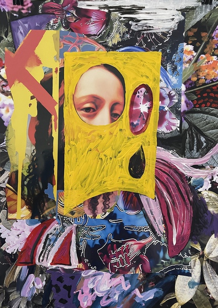 In der Collage "Heiliges Rauschen" verschmelzen sakrale Bildtradition und zeitgenössische Zeichenkultur zu einem vibrierenden Spannungsfeld. Das Werk zitiert im unteren Bildbereich das ikonische Antlitz Christi vom Turiner Grabtuch – jedoch nicht als religiöses Andachtsbild, sondern als gestörten, fragmentierten Abdruck. Die vertraute Heiligkeit erscheint hier verfremdet, überlagert von grellen Farbflächen, wilden Linien und grafischen Fragmenten, die an digitale Störungen oder urbane Graffiti erinnern.