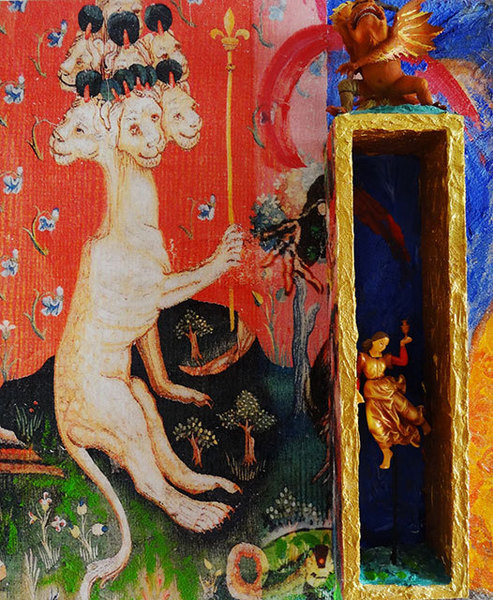 Warum wähle ich aus einer Tapisserie-Bildfolge, die im Spätmittelalter entstanden ist (Tapisserie von Angers), vorrangig Bildelemente für meine digitalen Collagen (wie hier die "Apokalypse"), obwohl offensichtlich die moderne Apokalyptik in Text und Bild nur mehr marginal von der religiösen Thematik bestimmt ist, wie sie am Ende des Neuen Testaments in der sogenannten „Offenbarung des Johannes“ erscheint?