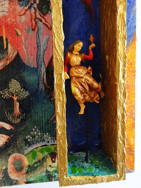 Da kommt noch die Sprache der Comics ins Bild, die, farblich nuanciert, die gewebten Bilder der Tapisserien – heute im Original zu sehen auf mehr als 120m Länge und 4m Höhe im Schloss von Angers – überlagern, destruieren und ergänzen?