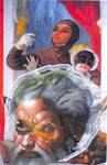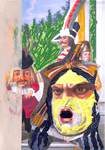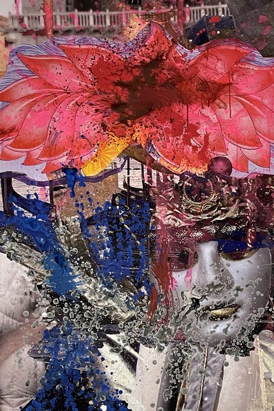 Die Elemente der Commedia dell'arte bringen eine andere Ebene der Maskerade ins Spiel. Diese italienische Theaterform, bekannt für ihre festgelegten Charaktertypen und Masken, betont die soziale Satire und die menschliche Komödie. Die Verbindung dieser beiden sehr unterschiedlichen kulturellen Ausdrücke in einer einzigen Collage schafft eine Brücke zwischen der ernsten, spirituellen Suche nach Selbsterkenntnis und der oft humorvollen, dramatischen Darstellung sozialer Interaktionen in der Commedia dell'arte.