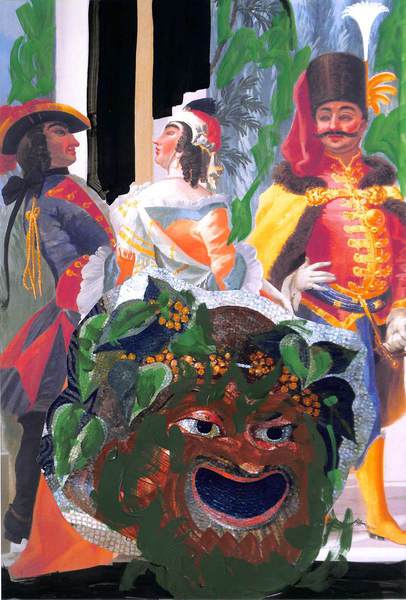 Die Verwendung dieser Motive aus der Wandmalerei der Villa der Mysterien nahe dem antiken Pompeji und Elementen der Commedia dell'arte verleiht der Collage "Masken mit Silen" eine komplexe kulturelle und historische Dimension.