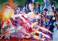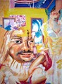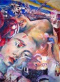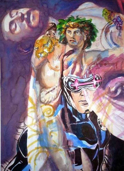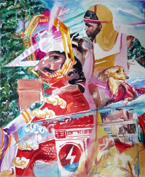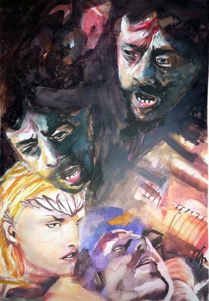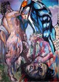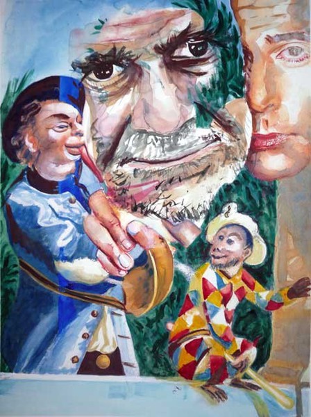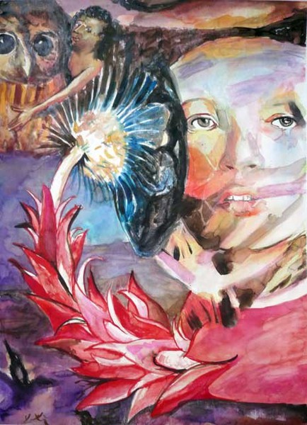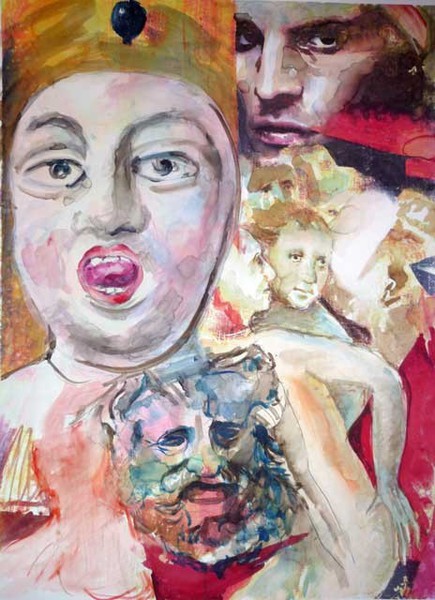 Das Aquarell mit dem Titel "Masken" zeigt zwei Figuren, die im Wasser treiben, mit einem lebendigen, farbenfrohen Hintergrund, der eine Landschaft andeutet. Auf der linken Seite ist eine Maske zu sehen, die antike und rituelle Züge trägt. Sie ist detailliert mit purpurnen und dunkelblauen Farbtönen gestaltet, was ihr eine mysteriöse und fast majestätische Aura verleiht. Ihre Augen sind leer, was typisch für eine Maske ist, und lassen sie unnahbar und geheimnisvoll wirken.