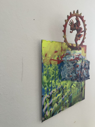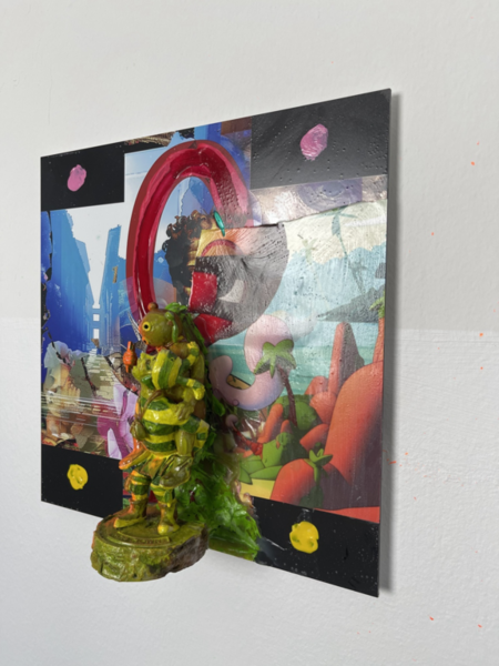 In diesen Relief-Collagen versuche ich Popkultur-Spielzeug, digitale Bildwelten und Übermalungen zu einer künstlerischen Reflexion über Geschichte, kulturelle Aneignung, Traumwelten und verlorene und wiedergefundene Identitäten zu verbinden.