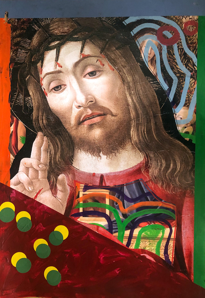 Color, overpainting, and collage deliberately intervene in the authority of the historical images. The gestures evoke a kind of visual archaeology: layers are exposed, destroyed, and reassembled. As a result, the sacred also appears as a cultural image that is constantly changing and open to new interpretations.