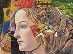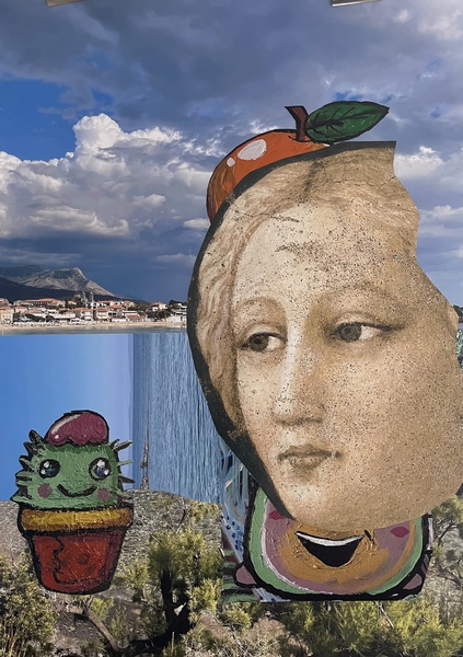 Diese Collage versteht sich als ein Dialog zwischen Frührenaissance, Pop-Ästhetik und persönlicher Bildsprache. Im Zentrum steht das markante Profil eines jungen Mannes des Frührenaissance-Malers Masolino aus einem Fresko der Cappella Brancacci in Florenz, einem Ort, der wie kaum ein anderer für den Aufbruch in eine neue Bildauffassung steht: Körperlichkeit, Perspektive und ein fast schon modernes Gespür für Präsenz.