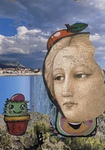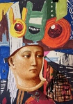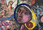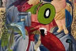 Doch diese kunst- und kulturhistorische Schwere wird bewusst unterlaufen. Neben dem ernsten, fast kontemplativen Antlitz erscheint eine lachende Gurke – entnommen aus einem eigenen Cutie-Gemälde – die mit kindlicher Direktheit und humorvoller Leichtigkeit in die Szene hineinplatzt. Sie wirkt wie ein Störsignal, das die Autorität der Tradition nicht zerstört, sondern irritiert. Daneben ein Ausschnitt aus einem neuen "Bildwelten"-Ölgemälde.