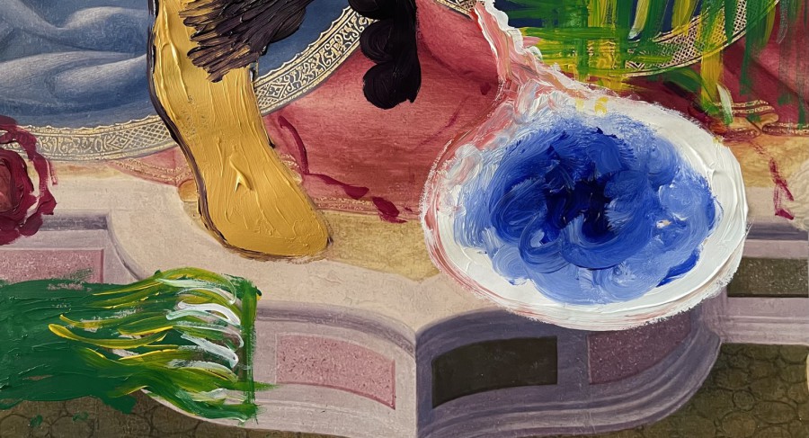 Yet this weight of art and cultural history is deliberately subverted. Beside the serious, almost contemplative face appears a laughing cucumber—taken from one of the artist’s own Cutie paintings—which bursts into the scene with childlike directness and humorous lightness. It acts like an interference signal that does not destroy the authority of tradition, but rather unsettles it. Next to it is a detail from a new “Bildwelten” oil painting.