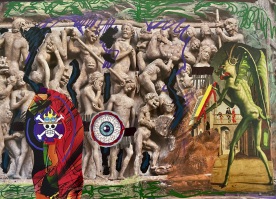 These collages unfold a multi-layered visual space in which religious iconography, art-historical references, and visual fragments of the present overlap. The starting point is the biblical narrative of the Temptation of Christ in the Desert—a moment of existential trial in which the relationship between spirit, power, and temptation is intensified. Yet the works do not stop at this theological primal scene. They expand the motif into a long-standing cultural figure: the devil as the counterpart, mirror, and co-player of humanity.