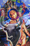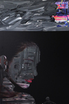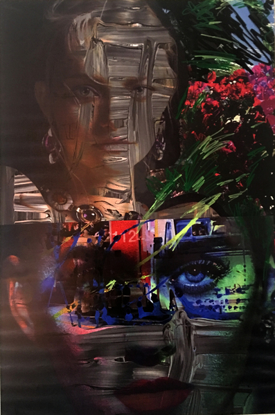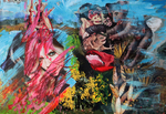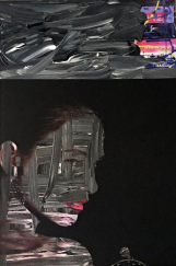Rettung durch Kunst? Oder gar durch Schönheit? Oder ist die Grenze zwischen schön und häßlich, – traditionell ausgedrückt zwischen gut und böse – unscharf, ja kaum vorhanden, so dass eins ins andere übergeht? In diesem Bild ist Vieles angedeutet, bleibt Vieles im Dunkeln, obwohl der Bildaufbau klar und überschaubar ist. Dieser Eindruck wird noch verstärkt durch die zwischen abstrakt-expressiver Malerei und Photographie, zwischen Analogem und Digitalem und zwischen Bild und Kopie oszillierende Bildwelt.