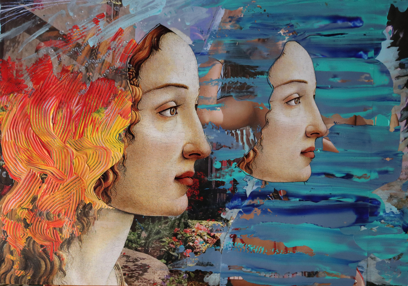 Ich mache mir die Bildsprache der Werbung und der klassischen Malerei gleichermaßen zunutze. Die glatten, perfekten Gesichter aus der Modefotografie stehen in einem Spannungsfeld zu expressiven Farbspuren, die sie teilweise verdecken, verzerren oder aggressiv durchkreuzen. Ikonische Gestalten der Kunstgeschichte – etwa Botticellis Simonetta – tauchen auf, werden aber in ein gegenwärtiges Spannungsfeld gezogen, das die Fragen nach Zeitlosigkeit, Projektion und Inszenierung von Schönheit neu stellt.