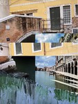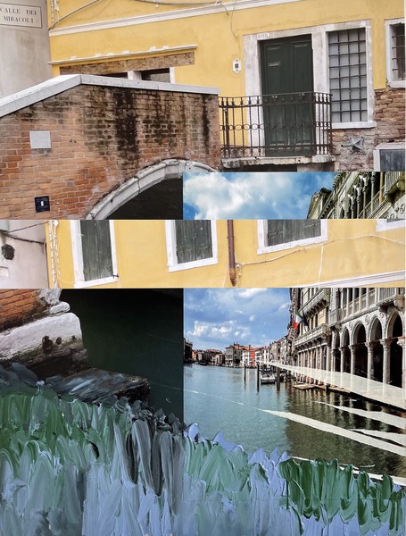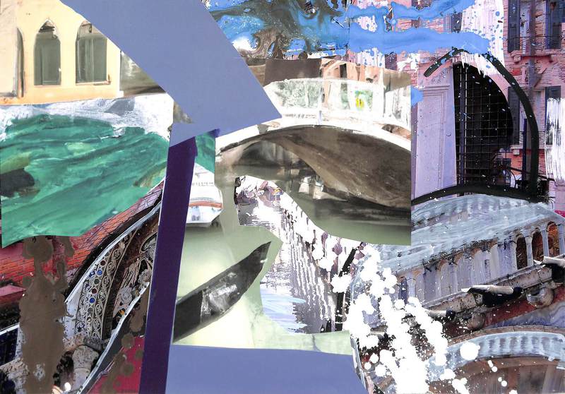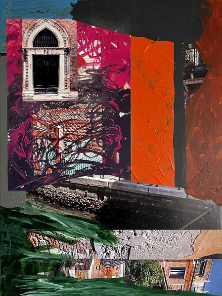 Meine Werkreihe "Venezia" thematisiert das Sehen im Zustand der Überlagerung. Ausgangspunkt sind fotografische Fragmente der Stadt Venedig – Brücken, Fassaden, Kanäle, Spiegelungen –, die nicht dokumentarisch festgehalten, sondern aufgebrochen, verschoben und neu zusammengesetzt werden. Malerei, Collage und fotografisches Bildmaterial greifen ineinander und erzeugen Bildräume, in denen Erinnerung, Gegenwart und Projektion gleichzeitig wirksam sind.