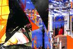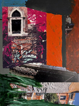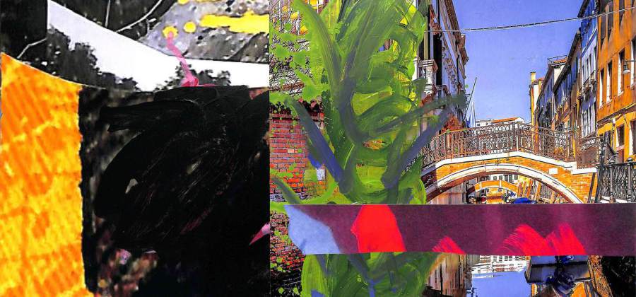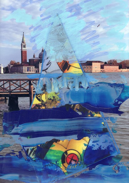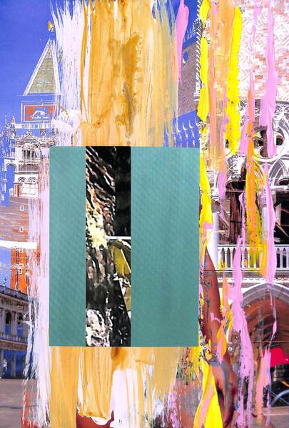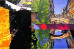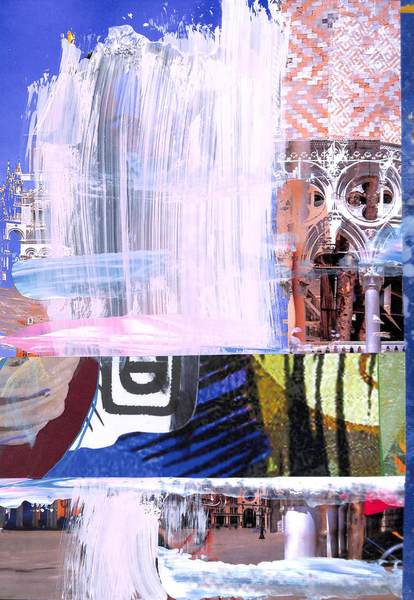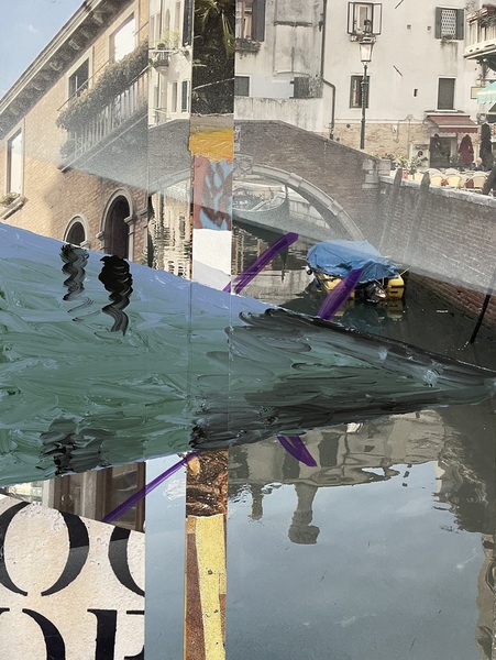 Die Stadt erscheint dabei nicht als geschlossenes Motiv, sondern als visuelles Archiv: Architektur wird zur Struktur, Wasser zur bewegten Fläche, Farbe zur eigenständigen Kraft. Durch Übermalungen, Schnitte und harte Übergänge entstehen Spannungen zwischen Figuration und Abstraktion. Das Wiedererkennbare wird bewusst gestört – Venedig zeigt sich fragmentiert, vielfach gespiegelt und immer wieder neu codiert.