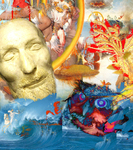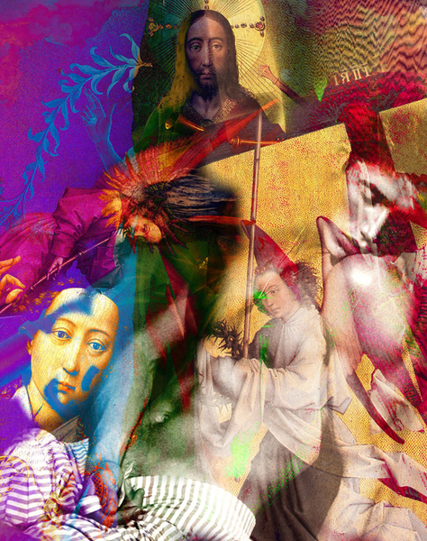 Mein Bild wirkt auf den ersten Blick wie ein visuelles Amalgam aus kunsthistorischen Fragmenten, digitalem Chaos und surrealer Ironie. Es vereint scheinbar unvereinbare Elemente: eine klassische Renaissance-Figur, religiöse Ikonografie, bestialische Kreaturen und eine majestätische Alpenlandschaft.