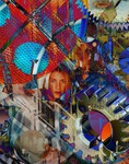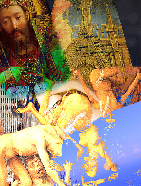 In der unteren Bildhälfte erkennt man in der Mitte eine Figur, den hl. Michael darstellend – aus dem Flügelaltar "Das Jüngste Gericht" von Roger van der Weyden. Seine Gelassenheit kontrastiert radikal mit dem restlichen Bildraum, in dem eine andere Figur verrenkt, entblößt und scheinbar von Tieren zerrissen wird. Diese Szene ist eingerahmt von einer roten Draperie (der untere Teil von Christus als Weltenrichter), die wie ein Bühnenvorhang herabfällt, als würde sich vor den Betrachtern eine grausame Theatralik entfalten.
